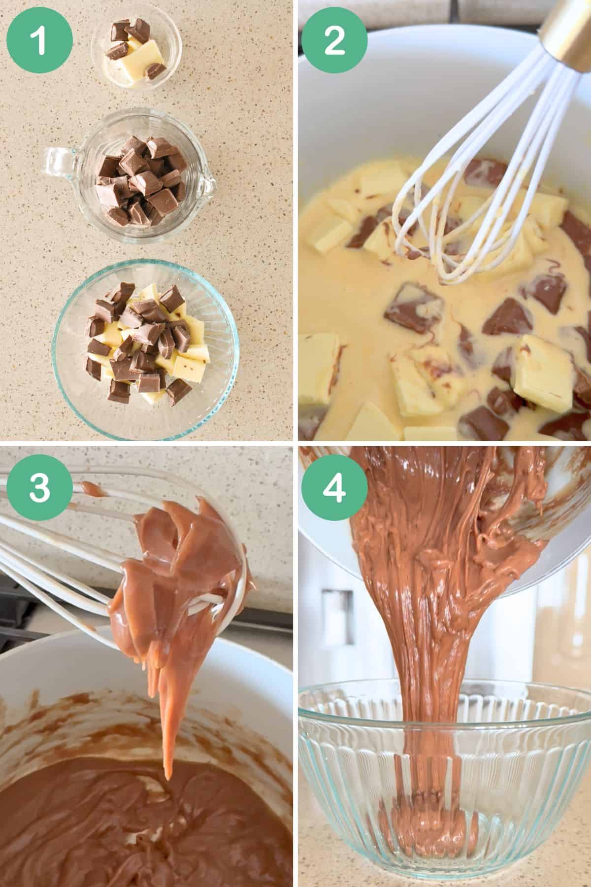 - Place cream, butter, Baileys, 145 grams white chocolate and 125 grams milk chocolate into a saucepan.