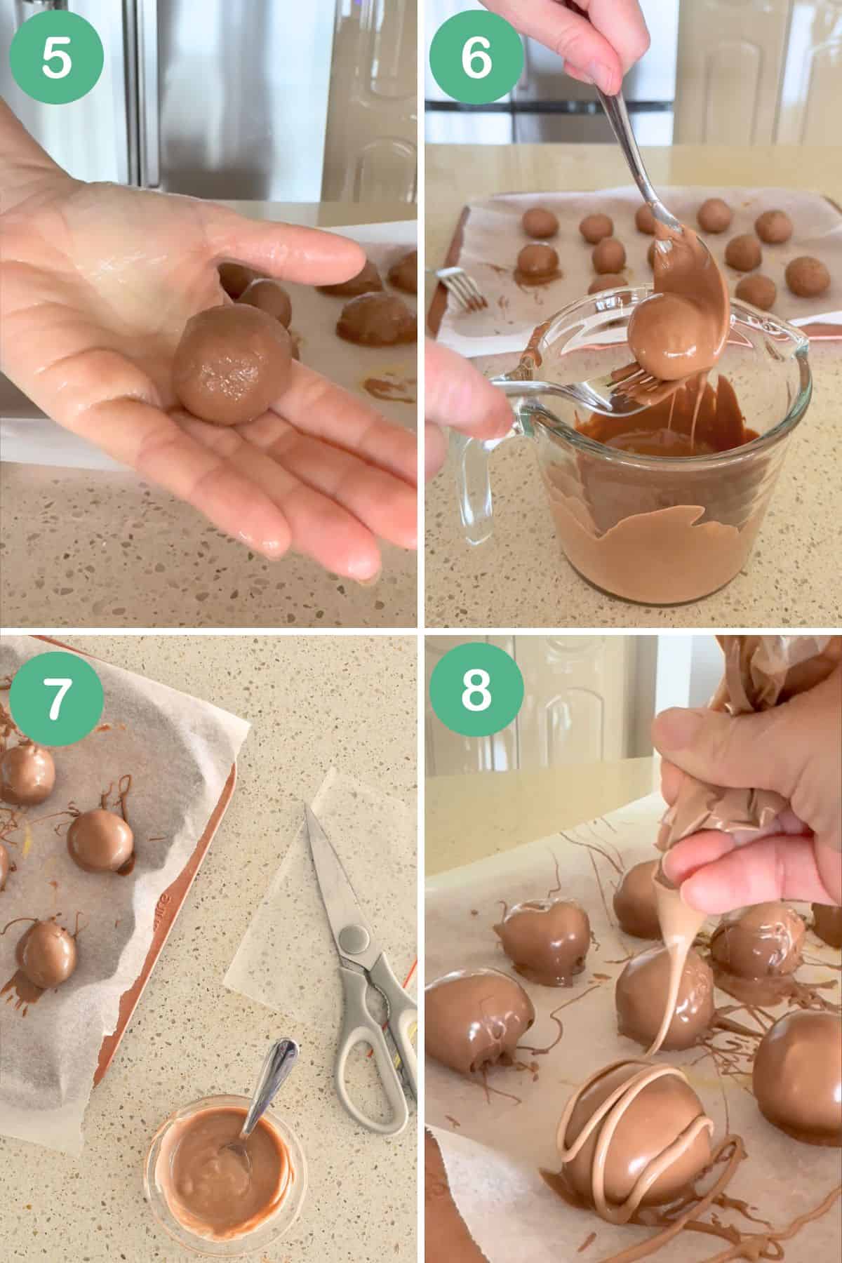 - Using a spoon and fork, dip balls into melted chocolate and let excess chocolate drizzle off before placing back on baking tray.