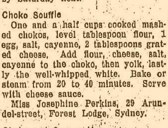 here's nothing quite as divine as a souffle. You've probably heard of Chocolate Souffle and Cheese Souffle. But what about Choko Souffle? This was the "Recipe of the Week" in The Maitland Mercury back in June 1937.