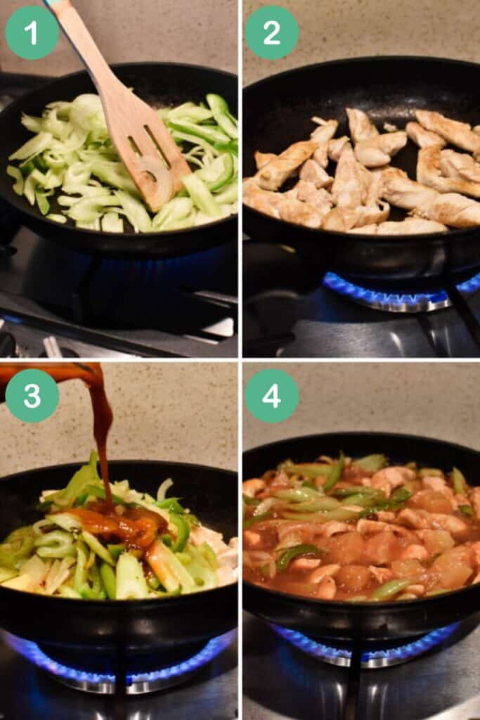 Cook chicken in the frying pan until browned on either side and almost cooked through (see image 2). Return the vegetables and pineapple to the frying pan along with the juice and sauce mix (see image 3). Pour the cornflour paste into the pan and stir over medium heat until mixture starts to thicken.