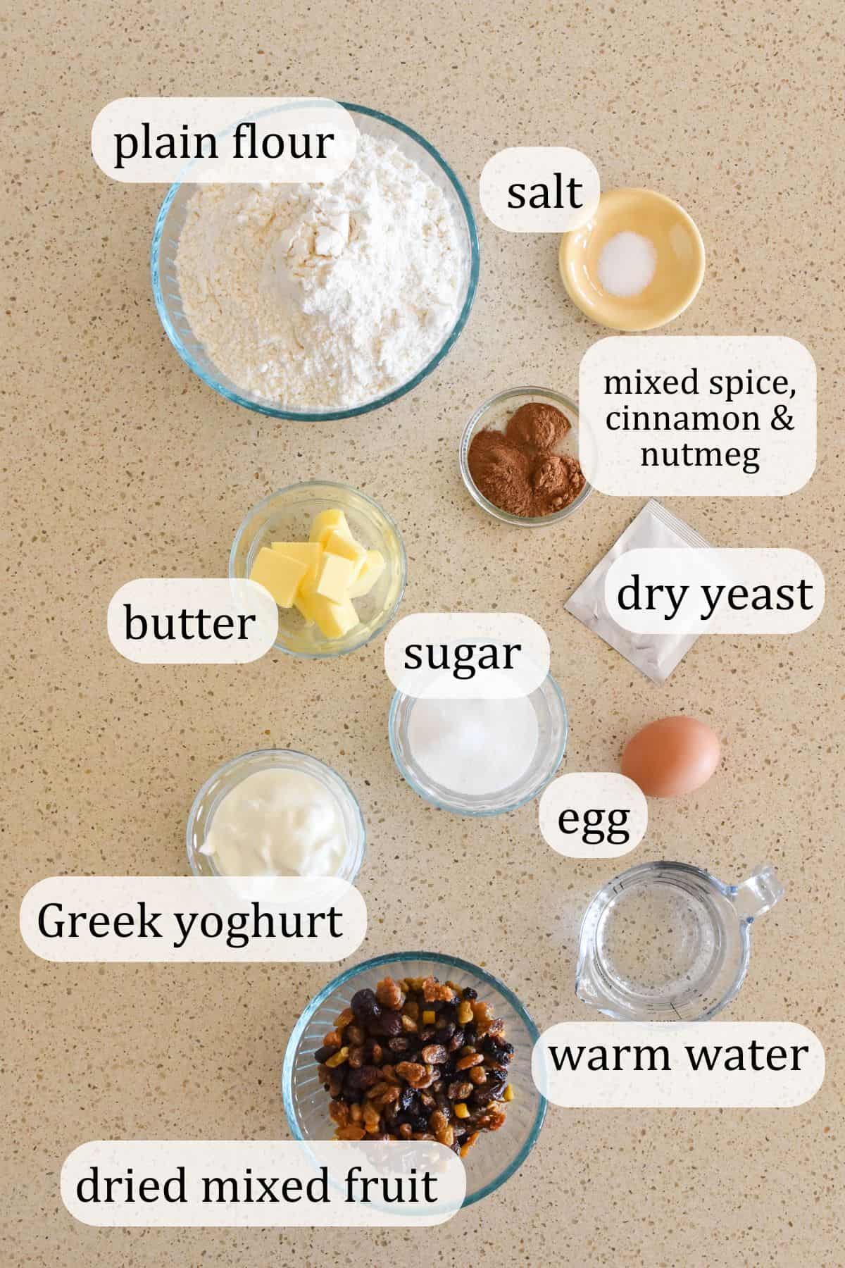 You'll need dry yeast, Greek yoghurt, mixed dried fruit and the spices (mixed spice, cinnamon and nutmeg). Plus just a handful of other pantry staples. The full list of ingredients and quantities is in the recipe card at the end of this post.