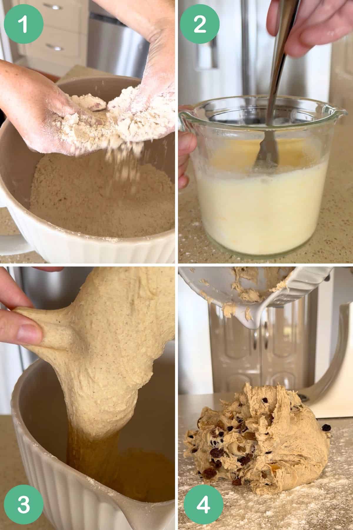 TIP: If the dough is sticky, add a small amount of plain flour and continue to knead. If the dough seems too dry (and isn't holding together) add a small amount of warm water and continue to knead. Add the mixed fruit and knead until the fruit is evenly distributed in the dough (see image 4).