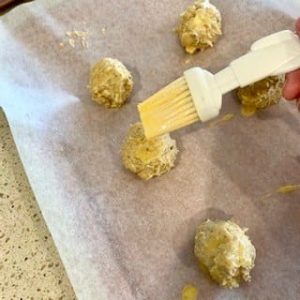 - Use a dessert spoon to scoop out portions of the mixture. Roll into small balls and place on trays lined with baking paper, leaving space for spreading. You should have about 18 cookies.