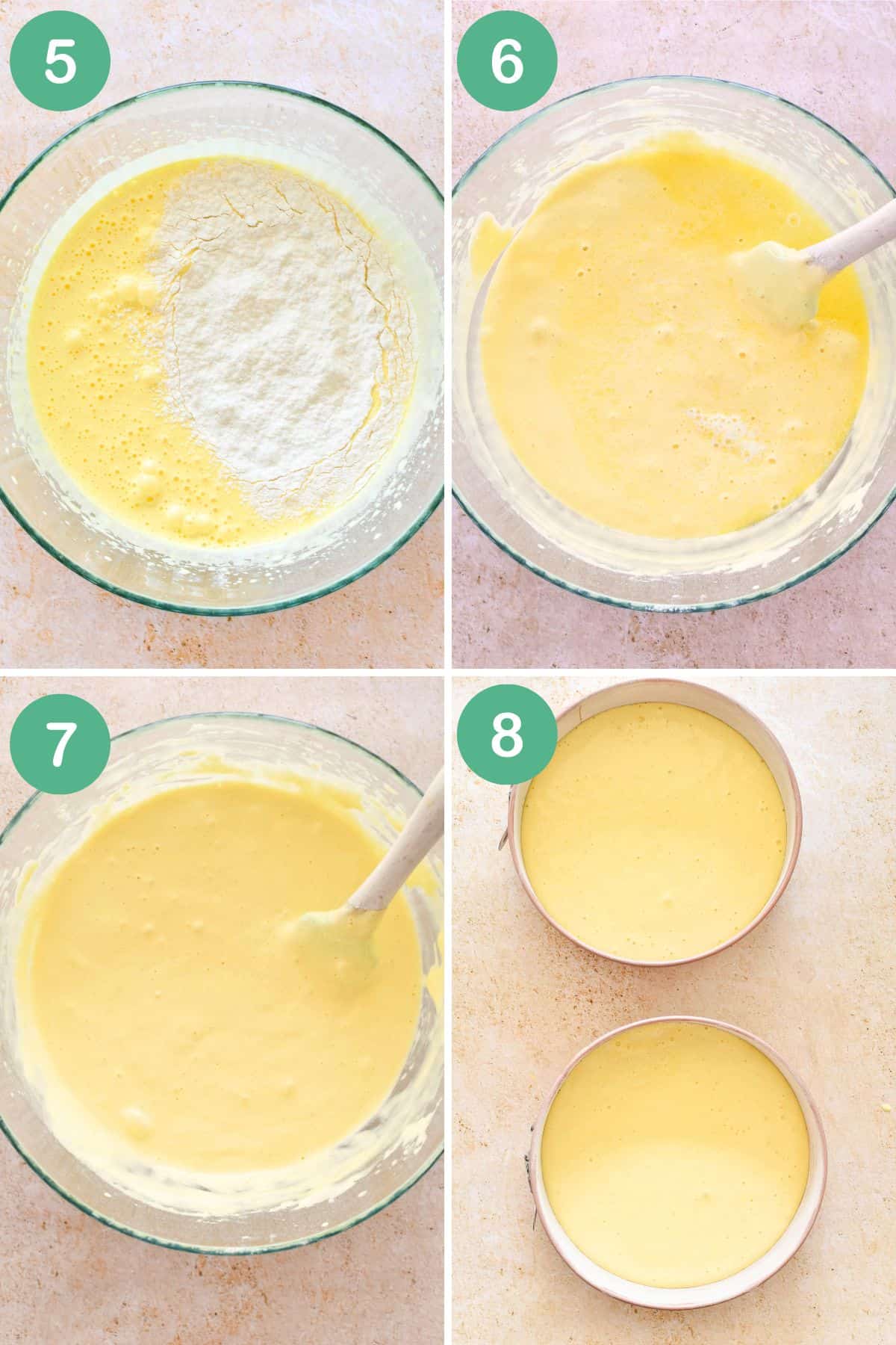 Sift flour, cornflour and cream of tartar together. Add half to the egg and sugar mixture (see image 5), folding together gently with a spatula. Add final half and, again, fold together gently (see image 6).