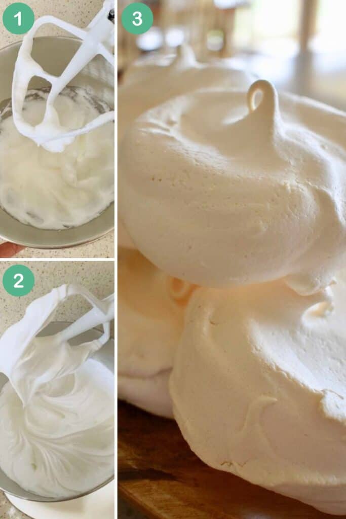 Beat the egg whites and salt on medium-high speed until the mixture forms soft peaks (see image 1). Add the sugar gradually while mixing on low speed. Then return to med-high speed and beat for another three minutes. The mixture should look thick and glossy (see image 2) – if it doesn't continue beating for another minute.