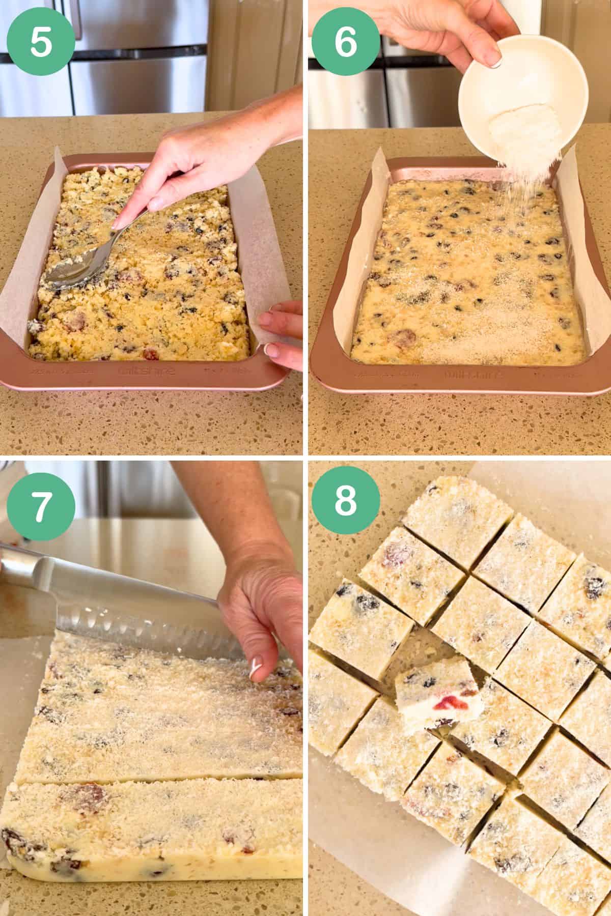 Press the mixture into slice tin using the back of a metal spoon (see image 5) and sprinkle top with remaining coconut (see image 6). Then it's into the fridge to set for at least an hour before you cut it into small squares using a sharp knife (see images 7 and 8).