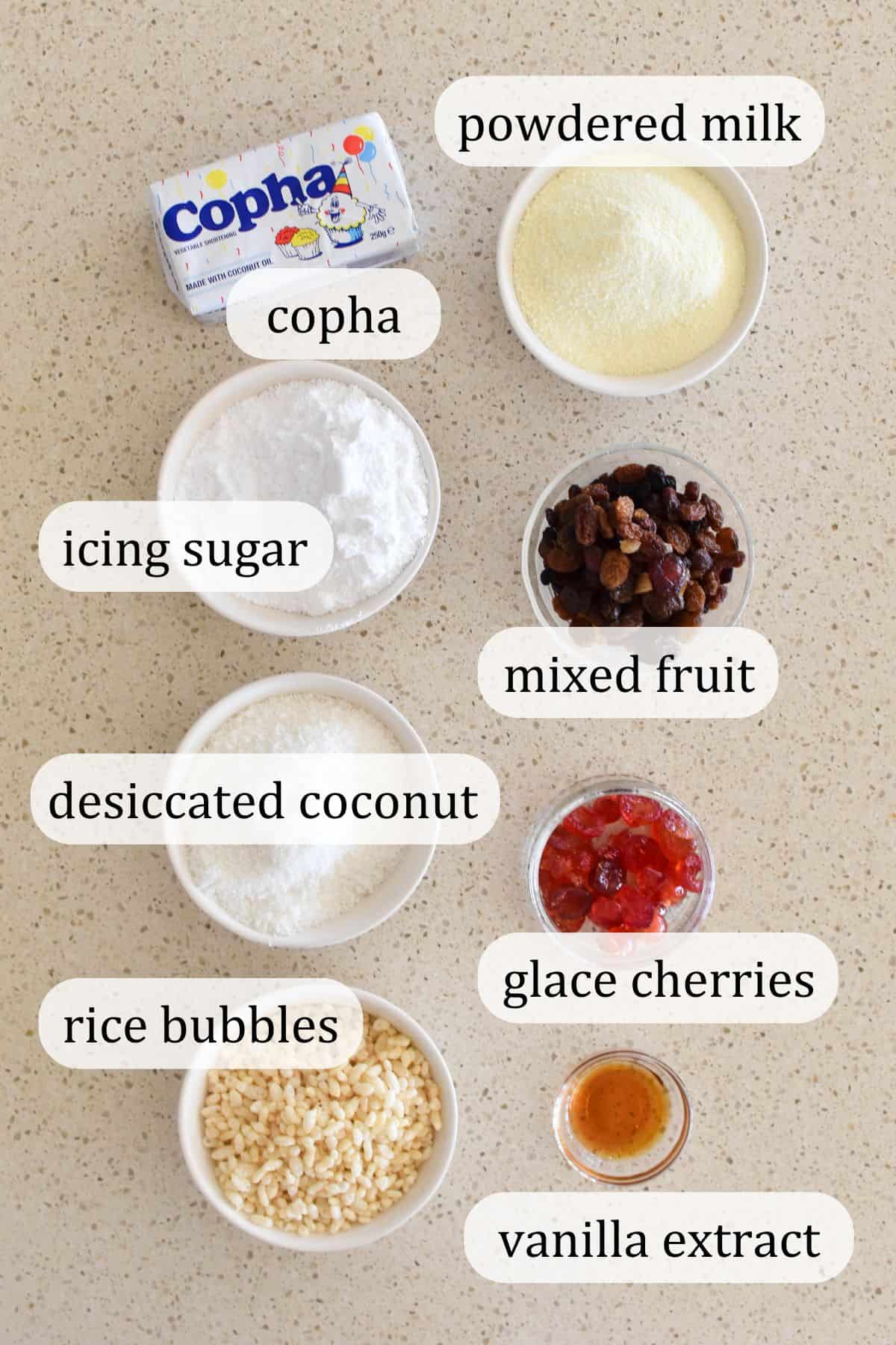 - Add powdered milk, icing sugar, mixed fruit, glace cherries, rice bubbles and ¾ cup of the coconut (retaining remaining ¼ cup) to a mixing bowl and stir to combine. Sprinkle vanilla extract over the mixture.